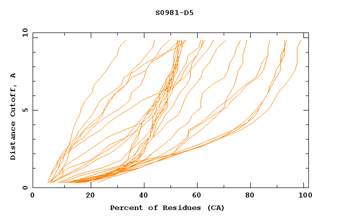 GDT analysis: largest set of CA atoms (percent of the modeled structure) that can fit under DISTANCE cutoff: 0.5A, 1.0A, 1.5A, ... , 10.0A