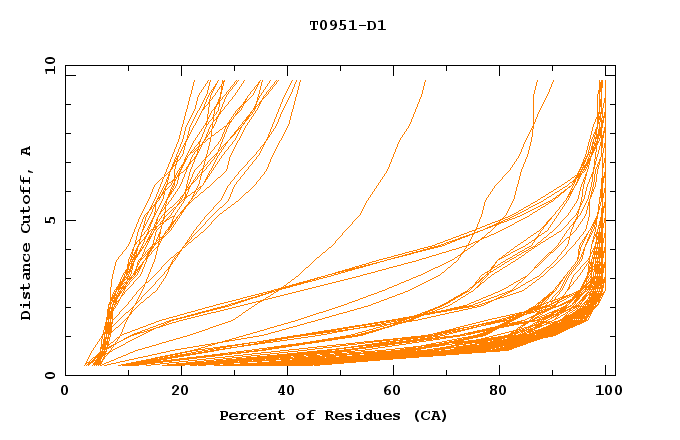 GDT analysis: largest set of CA atoms (percent of the modeled structure) that can fit under DISTANCE cutoff: 0.5A, 1.0A, 1.5A, ... , 10.0A