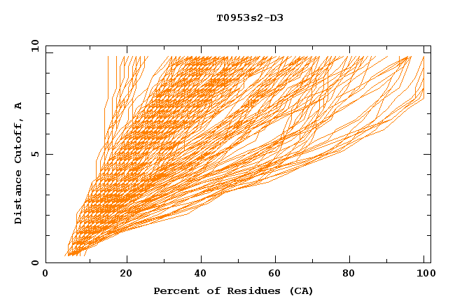 GDT analysis: largest set of CA atoms (percent of the modeled structure) that can fit under DISTANCE cutoff: 0.5A, 1.0A, 1.5A, ... , 10.0A