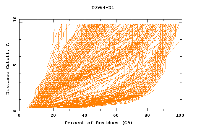 GDT analysis: largest set of CA atoms (percent of the modeled structure) that can fit under DISTANCE cutoff: 0.5A, 1.0A, 1.5A, ... , 10.0A
