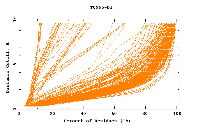 GDT analysis: largest set of CA atoms (percent of the modeled structure) that can fit under DISTANCE cutoff: 0.5A, 1.0A, 1.5A, ... , 10.0A