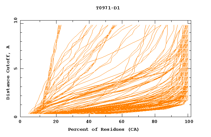 GDT analysis: largest set of CA atoms (percent of the modeled structure) that can fit under DISTANCE cutoff: 0.5A, 1.0A, 1.5A, ... , 10.0A