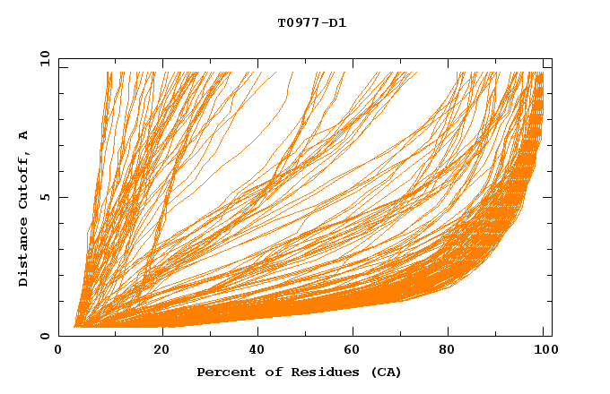 GDT analysis: largest set of CA atoms (percent of the modeled structure) that can fit under DISTANCE cutoff: 0.5A, 1.0A, 1.5A, ... , 10.0A