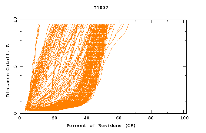 GDT analysis: largest set of CA atoms (percent of the modeled structure) that can fit under DISTANCE cutoff: 0.5A, 1.0A, 1.5A, ... , 10.0A