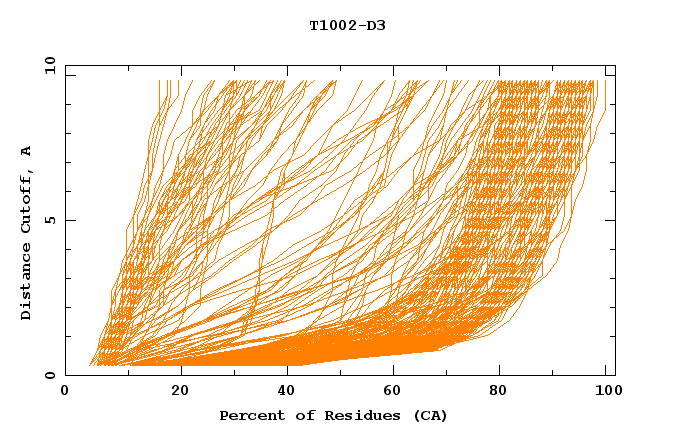 GDT analysis: largest set of CA atoms (percent of the modeled structure) that can fit under DISTANCE cutoff: 0.5A, 1.0A, 1.5A, ... , 10.0A