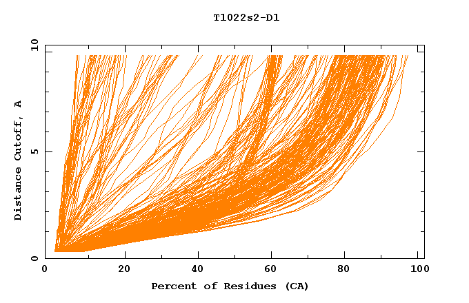 GDT analysis: largest set of CA atoms (percent of the modeled structure) that can fit under DISTANCE cutoff: 0.5A, 1.0A, 1.5A, ... , 10.0A