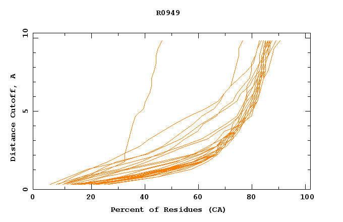 GDT analysis: largest set of CA atoms (percent of the modeled structure) that can fit under DISTANCE cutoff: 0.5A, 1.0A, 1.5A, ... , 10.0A