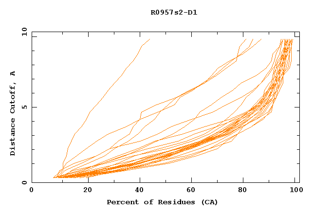 GDT analysis: largest set of CA atoms (percent of the modeled structure) that can fit under DISTANCE cutoff: 0.5A, 1.0A, 1.5A, ... , 10.0A