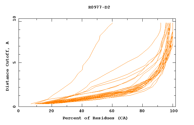 GDT analysis: largest set of CA atoms (percent of the modeled structure) that can fit under DISTANCE cutoff: 0.5A, 1.0A, 1.5A, ... , 10.0A