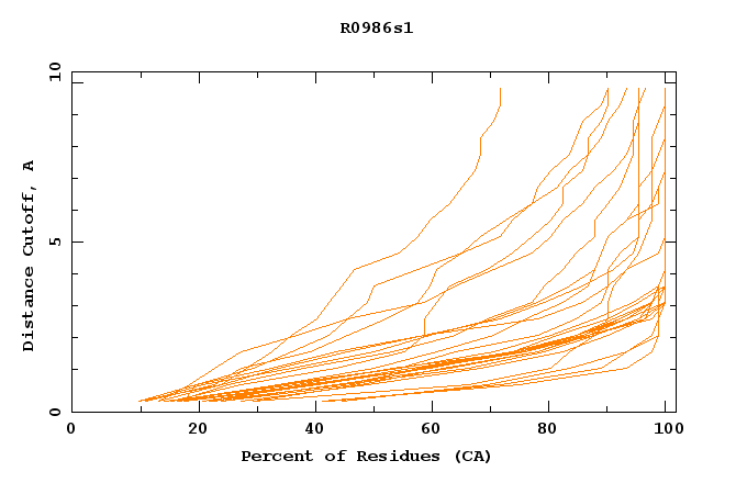 GDT analysis: largest set of CA atoms (percent of the modeled structure) that can fit under DISTANCE cutoff: 0.5A, 1.0A, 1.5A, ... , 10.0A