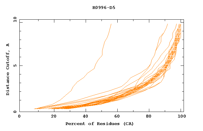 GDT analysis: largest set of CA atoms (percent of the modeled structure) that can fit under DISTANCE cutoff: 0.5A, 1.0A, 1.5A, ... , 10.0A