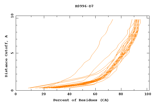 GDT analysis: largest set of CA atoms (percent of the modeled structure) that can fit under DISTANCE cutoff: 0.5A, 1.0A, 1.5A, ... , 10.0A
