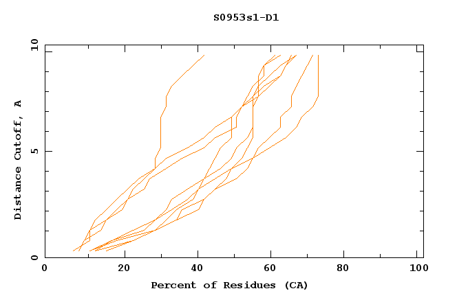 GDT analysis: largest set of CA atoms (percent of the modeled structure) that can fit under DISTANCE cutoff: 0.5A, 1.0A, 1.5A, ... , 10.0A
