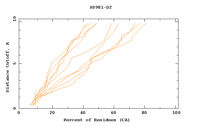 GDT analysis: largest set of CA atoms (percent of the modeled structure) that can fit under DISTANCE cutoff: 0.5A, 1.0A, 1.5A, ... , 10.0A