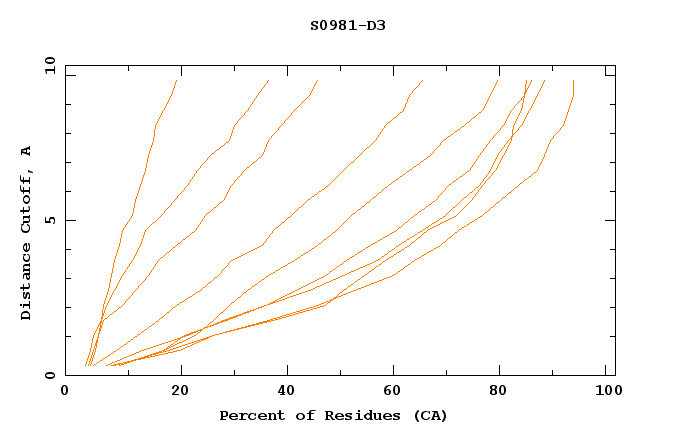 GDT analysis: largest set of CA atoms (percent of the modeled structure) that can fit under DISTANCE cutoff: 0.5A, 1.0A, 1.5A, ... , 10.0A