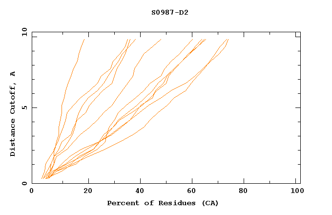 GDT analysis: largest set of CA atoms (percent of the modeled structure) that can fit under DISTANCE cutoff: 0.5A, 1.0A, 1.5A, ... , 10.0A
