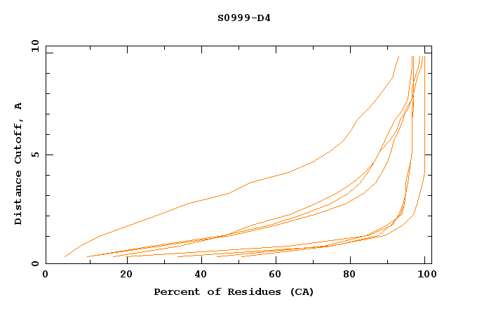 GDT analysis: largest set of CA atoms (percent of the modeled structure) that can fit under DISTANCE cutoff: 0.5A, 1.0A, 1.5A, ... , 10.0A