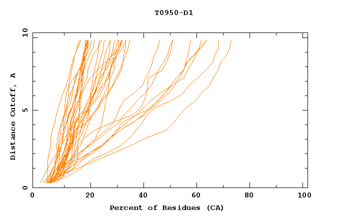 GDT analysis: largest set of CA atoms (percent of the modeled structure) that can fit under DISTANCE cutoff: 0.5A, 1.0A, 1.5A, ... , 10.0A