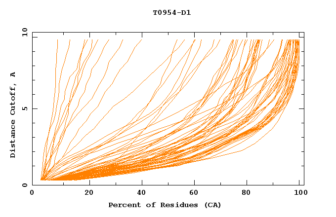 GDT analysis: largest set of CA atoms (percent of the modeled structure) that can fit under DISTANCE cutoff: 0.5A, 1.0A, 1.5A, ... , 10.0A