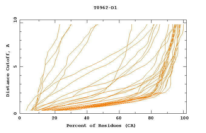 GDT analysis: largest set of CA atoms (percent of the modeled structure) that can fit under DISTANCE cutoff: 0.5A, 1.0A, 1.5A, ... , 10.0A