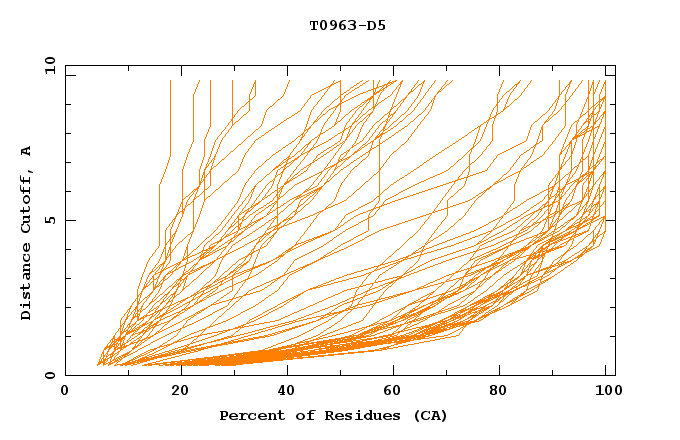 GDT analysis: largest set of CA atoms (percent of the modeled structure) that can fit under DISTANCE cutoff: 0.5A, 1.0A, 1.5A, ... , 10.0A