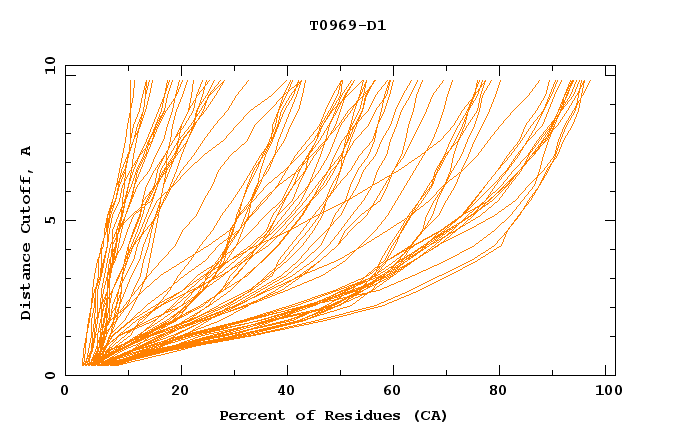 GDT analysis: largest set of CA atoms (percent of the modeled structure) that can fit under DISTANCE cutoff: 0.5A, 1.0A, 1.5A, ... , 10.0A