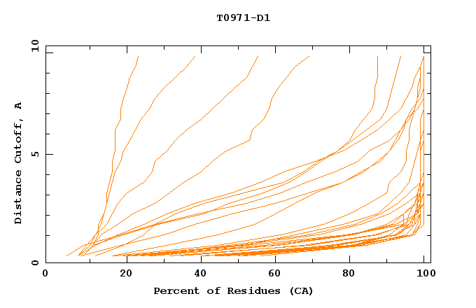 GDT analysis: largest set of CA atoms (percent of the modeled structure) that can fit under DISTANCE cutoff: 0.5A, 1.0A, 1.5A, ... , 10.0A
