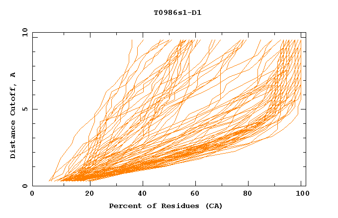 GDT analysis: largest set of CA atoms (percent of the modeled structure) that can fit under DISTANCE cutoff: 0.5A, 1.0A, 1.5A, ... , 10.0A