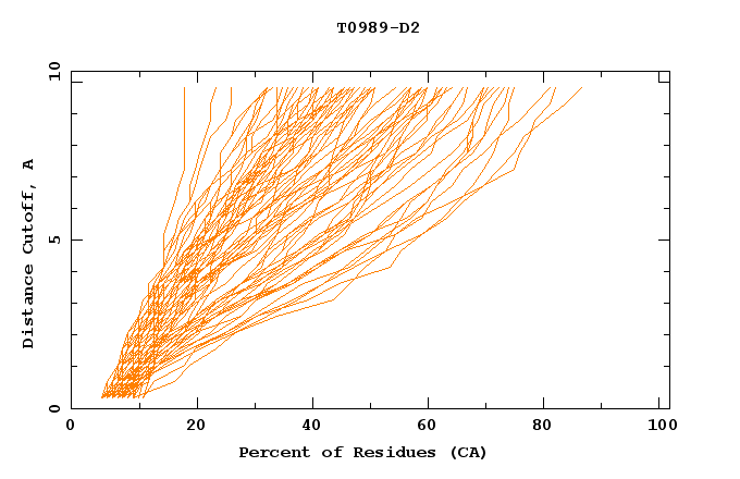 GDT analysis: largest set of CA atoms (percent of the modeled structure) that can fit under DISTANCE cutoff: 0.5A, 1.0A, 1.5A, ... , 10.0A