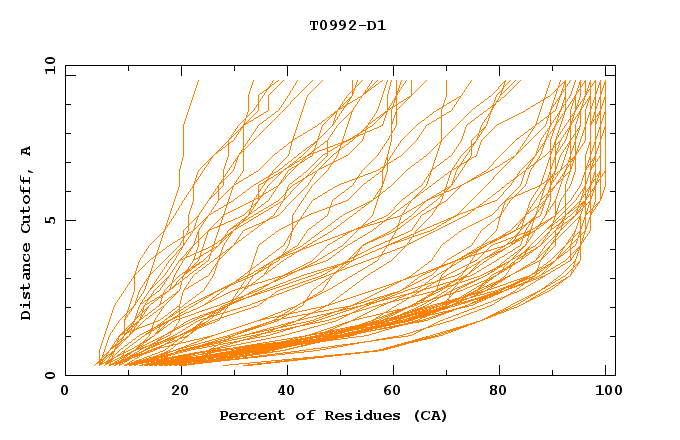 GDT analysis: largest set of CA atoms (percent of the modeled structure) that can fit under DISTANCE cutoff: 0.5A, 1.0A, 1.5A, ... , 10.0A