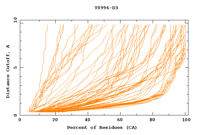 GDT analysis: largest set of CA atoms (percent of the modeled structure) that can fit under DISTANCE cutoff: 0.5A, 1.0A, 1.5A, ... , 10.0A