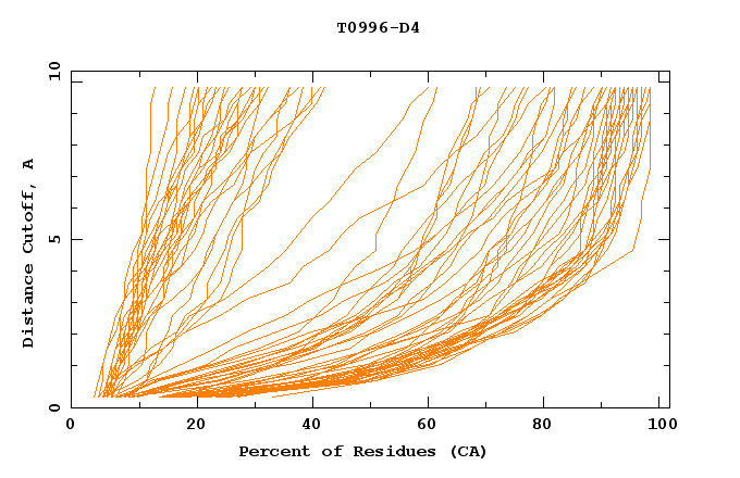 GDT analysis: largest set of CA atoms (percent of the modeled structure) that can fit under DISTANCE cutoff: 0.5A, 1.0A, 1.5A, ... , 10.0A