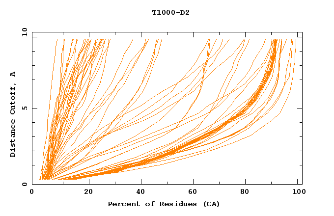 GDT analysis: largest set of CA atoms (percent of the modeled structure) that can fit under DISTANCE cutoff: 0.5A, 1.0A, 1.5A, ... , 10.0A