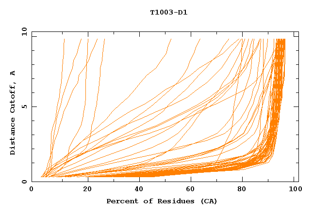 GDT analysis: largest set of CA atoms (percent of the modeled structure) that can fit under DISTANCE cutoff: 0.5A, 1.0A, 1.5A, ... , 10.0A