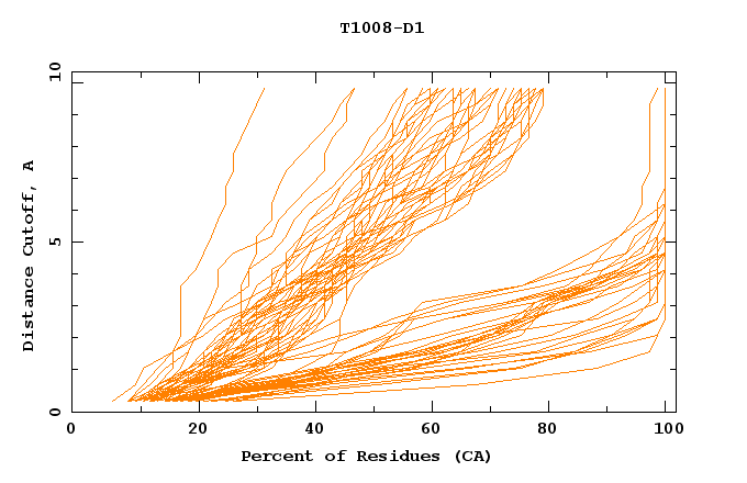 GDT analysis: largest set of CA atoms (percent of the modeled structure) that can fit under DISTANCE cutoff: 0.5A, 1.0A, 1.5A, ... , 10.0A