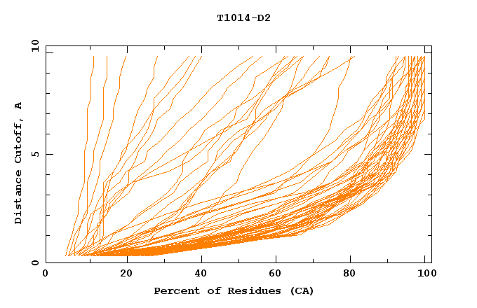 GDT analysis: largest set of CA atoms (percent of the modeled structure) that can fit under DISTANCE cutoff: 0.5A, 1.0A, 1.5A, ... , 10.0A