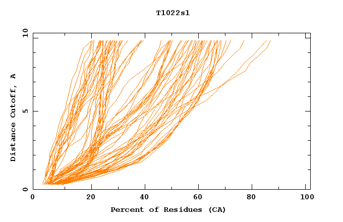 GDT analysis: largest set of CA atoms (percent of the modeled structure) that can fit under DISTANCE cutoff: 0.5A, 1.0A, 1.5A, ... , 10.0A