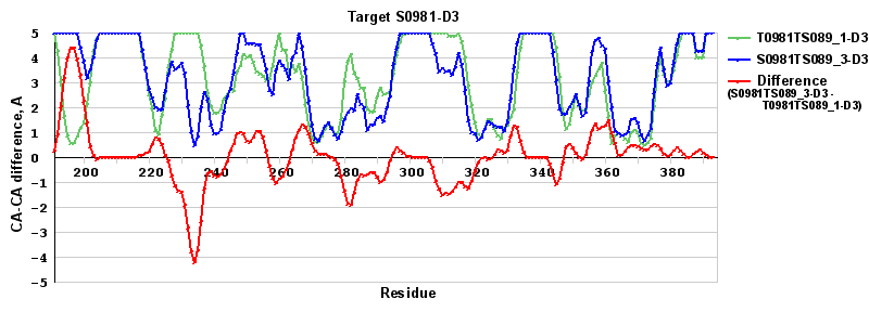 | Red line = (blue line) - (green thick line): difference between the corresponding "Assisted Model"-Target and "Regular Model"-Target CA-CA distances (see above). Negative values show regions where the "assisted" model has better fit to the target than the reference model, i.e. areas of potential improvement. |