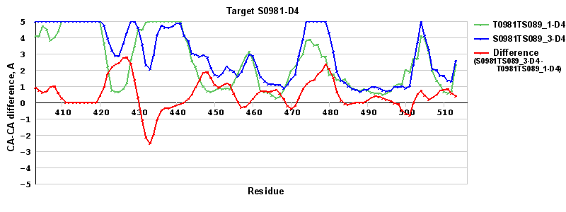 | Red line = (blue line) - (green thick line): difference between the corresponding "Assisted Model"-Target and "Regular Model"-Target CA-CA distances (see above). Negative values show regions where the "assisted" model has better fit to the target than the reference model, i.e. areas of potential improvement. |