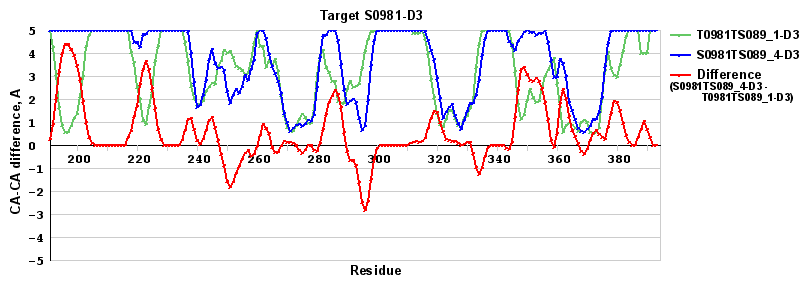 | Red line = (blue line) - (green thick line): difference between the corresponding "Assisted Model"-Target and "Regular Model"-Target CA-CA distances (see above). Negative values show regions where the "assisted" model has better fit to the target than the reference model, i.e. areas of potential improvement. |