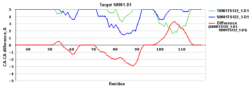 | Red line = (blue line) - (green thick line): difference between the corresponding "Assisted Model"-Target and "Regular Model"-Target CA-CA distances (see above). Negative values show regions where the "assisted" model has better fit to the target than the reference model, i.e. areas of potential improvement. |