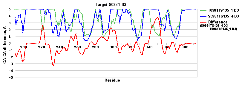 | Red line = (blue line) - (green thick line): difference between the corresponding "Assisted Model"-Target and "Regular Model"-Target CA-CA distances (see above). Negative values show regions where the "assisted" model has better fit to the target than the reference model, i.e. areas of potential improvement. |
