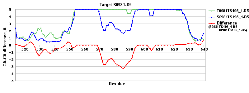 Red line = (blue line) - (green thick line): difference between the corresponding "Assisted Model"-Target and "Regular Model"-Target CA-CA distances (see above). Negative values show regions where the "assisted" model has better fit to the target than the reference model, i.e. areas of potential improvement.