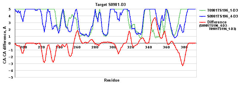 | Red line = (blue line) - (green thick line): difference between the corresponding "Assisted Model"-Target and "Regular Model"-Target CA-CA distances (see above). Negative values show regions where the "assisted" model has better fit to the target than the reference model, i.e. areas of potential improvement. |