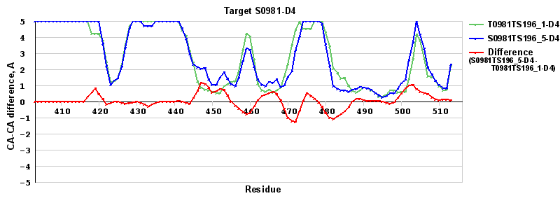 | Red line = (blue line) - (green thick line): difference between the corresponding "Assisted Model"-Target and "Regular Model"-Target CA-CA distances (see above). Negative values show regions where the "assisted" model has better fit to the target than the reference model, i.e. areas of potential improvement. |