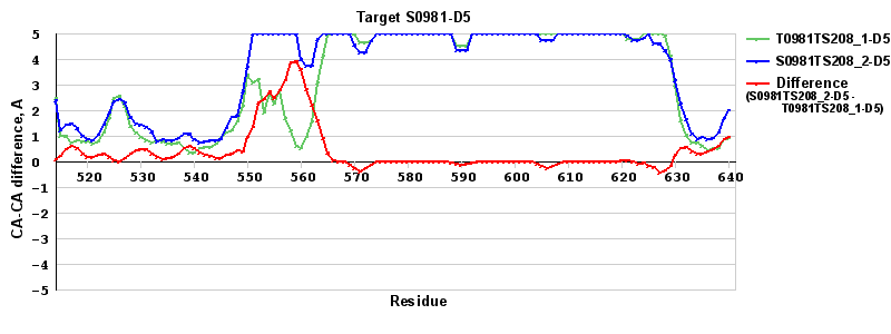 Red line = (blue line) - (green thick line): difference between the corresponding "Assisted Model"-Target and "Regular Model"-Target CA-CA distances (see above). Negative values show regions where the "assisted" model has better fit to the target than the reference model, i.e. areas of potential improvement.