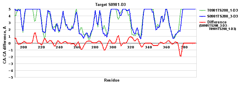 Red line = (blue line) - (green thick line): difference between the corresponding "Assisted Model"-Target and "Regular Model"-Target CA-CA distances (see above). Negative values show regions where the "assisted" model has better fit to the target than the reference model, i.e. areas of potential improvement.