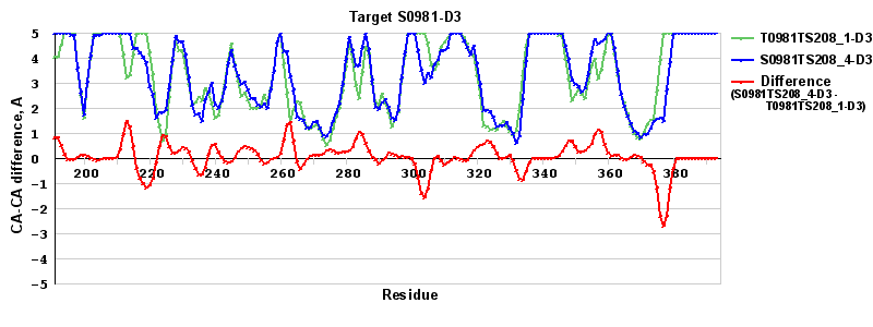 | Red line = (blue line) - (green thick line): difference between the corresponding "Assisted Model"-Target and "Regular Model"-Target CA-CA distances (see above). Negative values show regions where the "assisted" model has better fit to the target than the reference model, i.e. areas of potential improvement. |