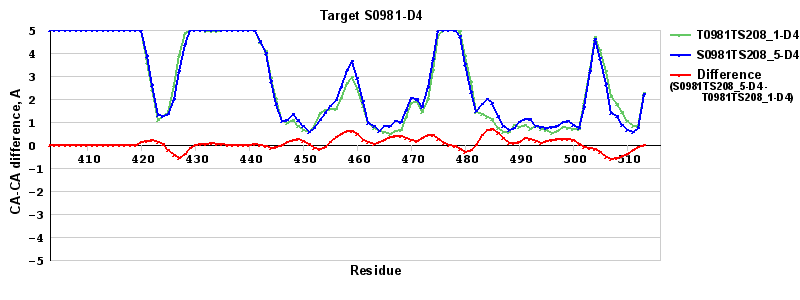| Red line = (blue line) - (green thick line): difference between the corresponding "Assisted Model"-Target and "Regular Model"-Target CA-CA distances (see above). Negative values show regions where the "assisted" model has better fit to the target than the reference model, i.e. areas of potential improvement. |