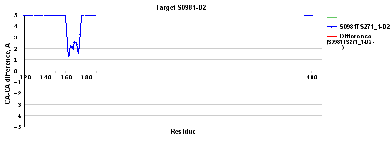| Red line = (blue line) - (green thick line): difference between the corresponding "Assisted Model"-Target and "Regular Model"-Target CA-CA distances (see above). Negative values show regions where the "assisted" model has better fit to the target than the reference model, i.e. areas of potential improvement. |